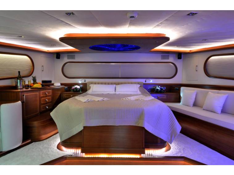 Dolce Mare Gulet is a 36.00 m. meters wooden crewed yacht which launched in 2011. She designed for luxury private crewed yacht charters with modern and large cabins, saloon and deck. 2 master cabin with french bed, 2 double cabins, 2 triple cabin with 1 double + 1 single bed is offering spacious accommodation up to 12 people. In each cabin, including seperately placed shower unit, it has its own private shower and toilet. All the yacht, including the cabins are air-conditioned.